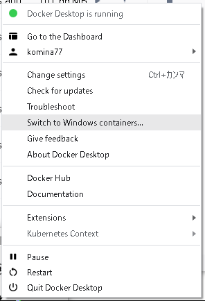 Dockerを稼働するとタスクトレイにクジラのアイコンが現れます。Dockerは標準でLinuxコンテナになっているので、Windowsコンテナへ切り替えます。アイコンを右クリックして「Switch to Windows containers..」をクリックして切り替えます。