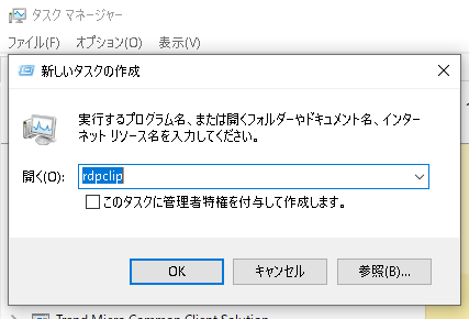 その後に、タスクマネージャのファイル>新しいタスクの実行から「rdpclip.exe」を実行してください。