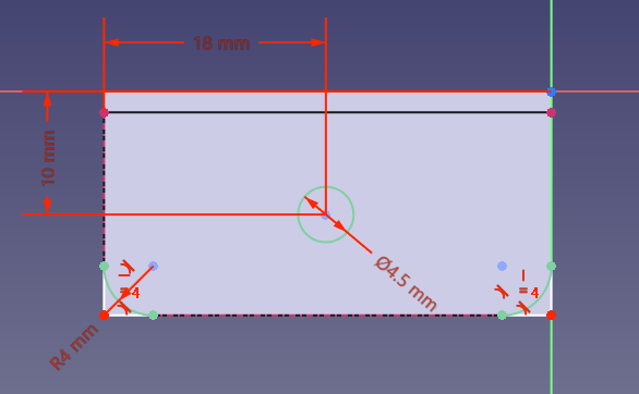 曲げR 0.5mm、板厚1.2mm であることから逆算して、18.2-1.2-0.5=16.5mmとした。 - スケッチを作成し、板から抜きたい部分(ネジ穴と角丸)を書く。