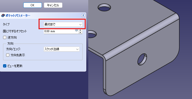 - スケッチを閉じ、Pocket で抜く。タイプは「最初まで」にしておくと板厚に影響を受けない。