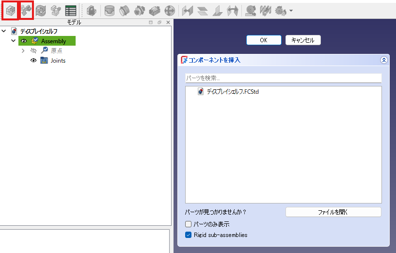 - アセンブリ作成ボタン押下、さらにコンポーネント挿入ボタン押下する。
