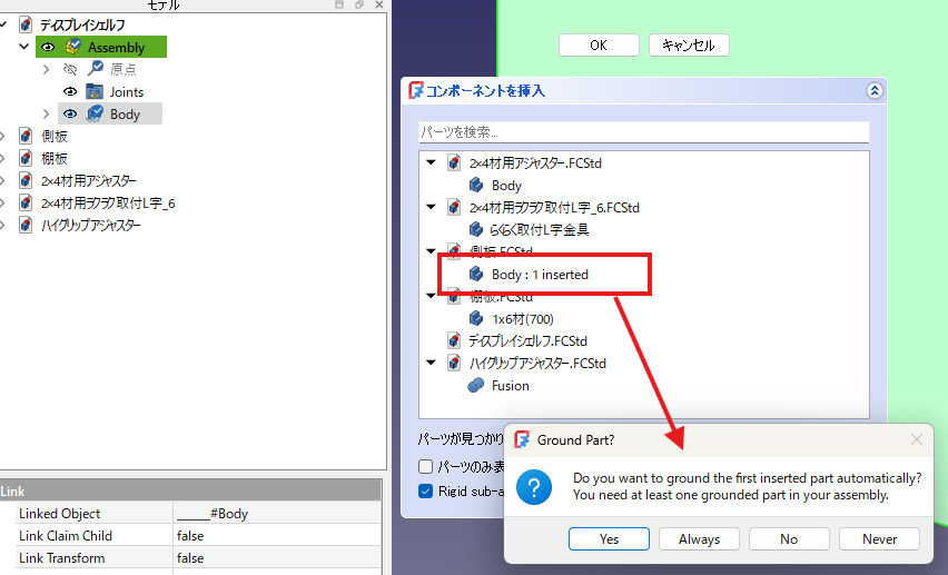 - 最初の部品を挿入すると基準パーツにするかを問うダイアログが出てくるので、Yesボタン押下する。