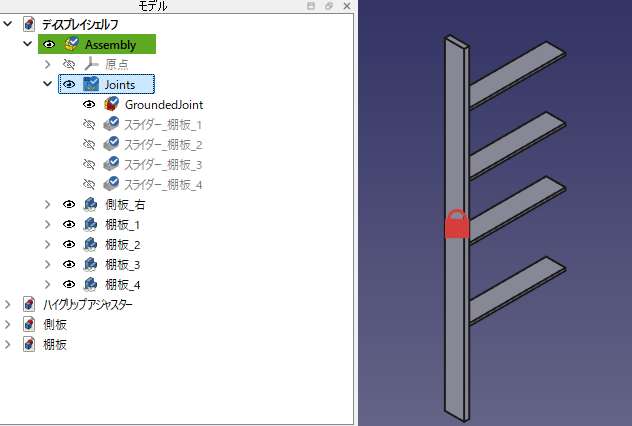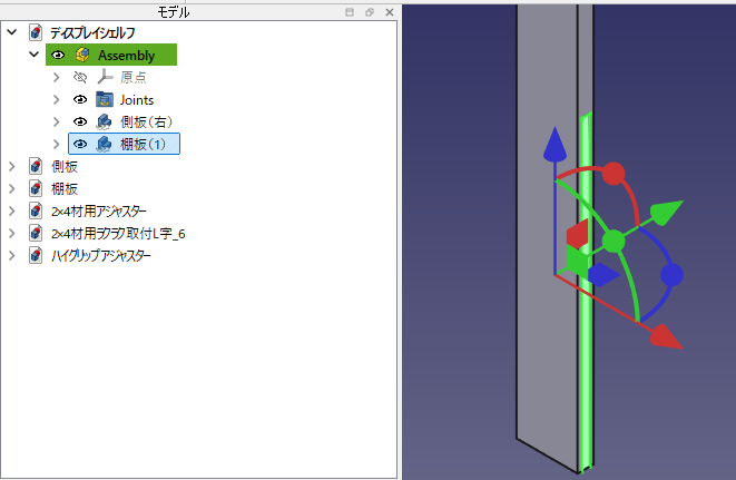 こちらも棚板の前面にピッタリくっつきました。ここで「側板_左」を表示状態に戻してみると、いい感じに組みあがっていることが分かります。