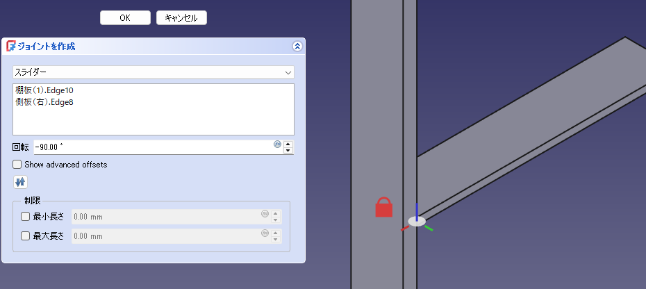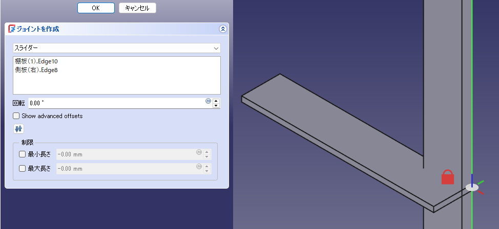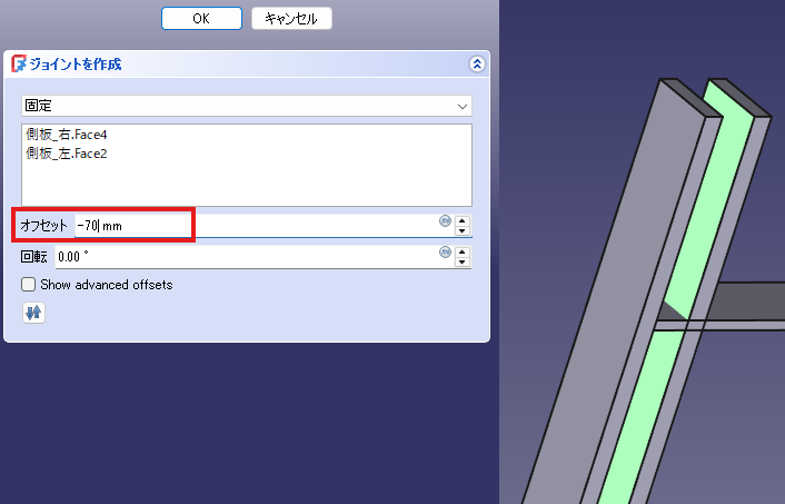 - 側板_右と側板_左を固定ジョイント、オフセットを棚板の長さ700mmで固定する。