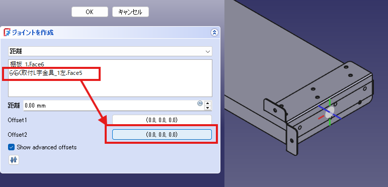 - 選択した面同士がピタっとくっつくので、オフセット値を調整する。