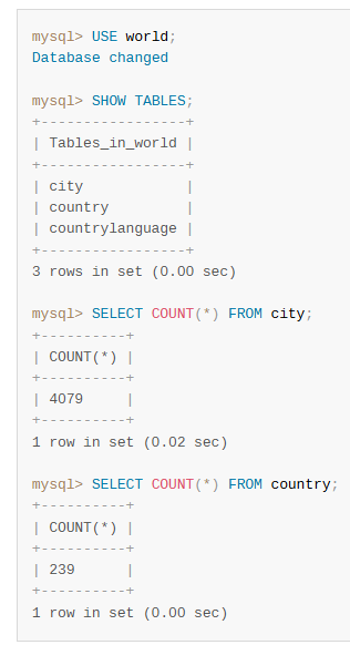 city, country, countryLanguage の3つのテーブルから構成されるデータベースになります。