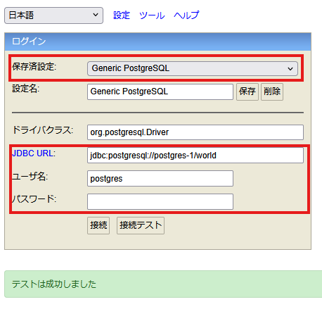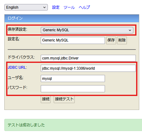 ホストOS上のブラウザで、http://localhost:8082/ を開き、保存済設定の中から「Generic MySQL」を選びます。ドライバクラスなどのデフォルト設定が表示されるので、JDBC URLやユーザ名、パスワード(mysql/mysql)を入力します。接続テストが通れば成功です。