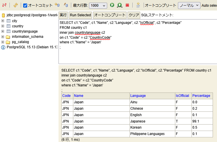 オートコンプリート機能も有効で、ちょっとしたSQLならすぐに試してみることができます。PostgreSQLの大文字小文字混在のカラムはダブルコーテーションで囲わないといけないので、逆に不便でした。