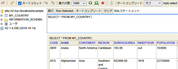AND ("T2"."COUNTRYCODE" = "T1"."CODE"))FROM句で指定していたテーブルが MY_COUNTRY から PG_COUNTRYLANGUAGE に変わっていますね。H2DB では結合順序指定するヒント句はサポートされていません。性能を高めるには希望する結合順になるまで SQLをこねくり回すしかなさそうです。