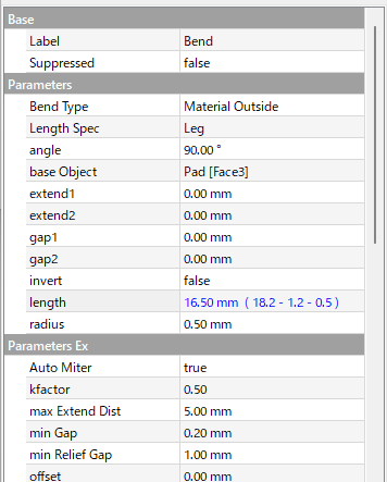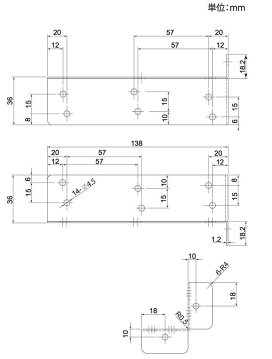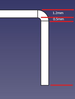 曲げR 0.5mm、板厚1.2mm であることから逆算して、18.2-1.2-0.5=16.5mmとした。