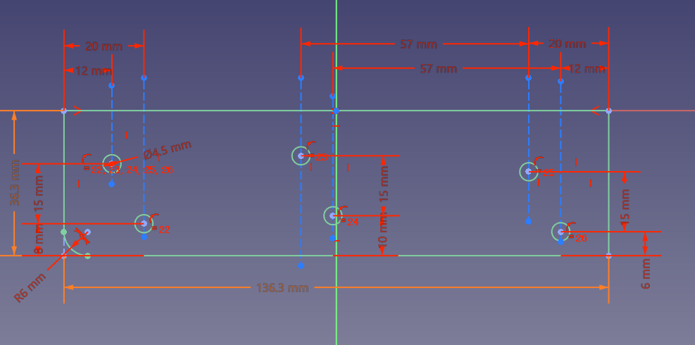- スケッチを作成し、板から抜きたい部分(ネジ穴と角丸)を書く。