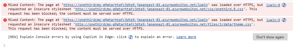 Azureで生成される長いURLのせいで難しいことが書いてあるように見えますが、よくよく読むとスタイルシートの読み込みで https を使っていないことで怒られているようです。このせいでスタイルシートが読み込まれなかったようです。