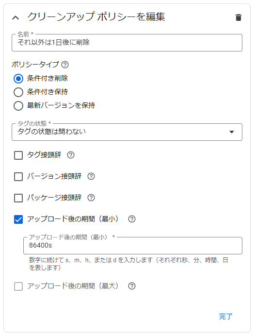 それ以外のイメージを削除するルールを登録します。今回は1日経過したものを対象としてみました。(入力時は 1d としましたが開きなおすと 86400s になっていました)
